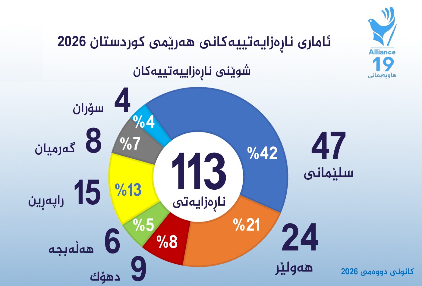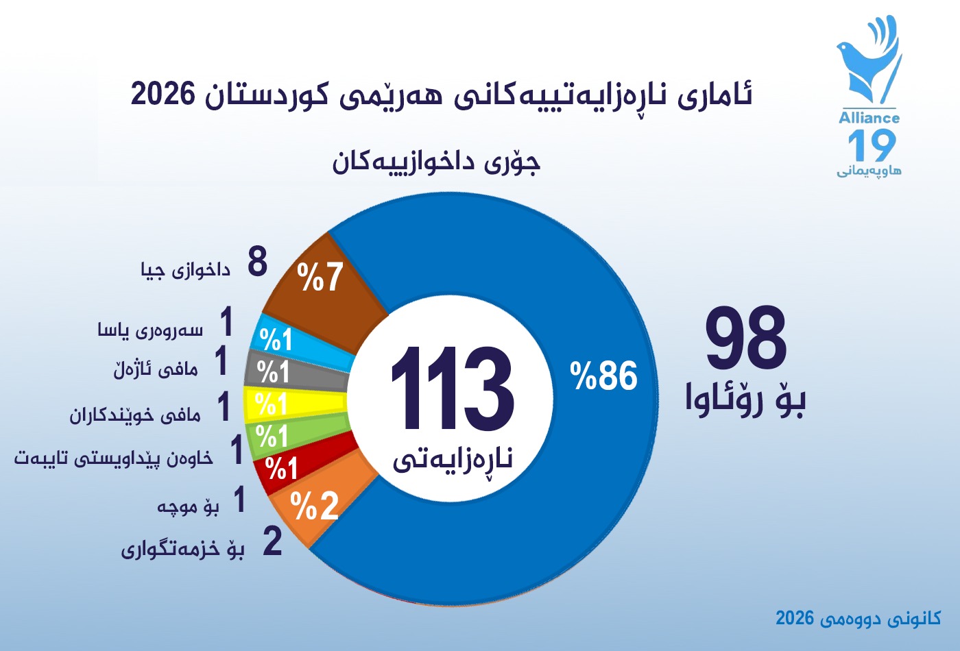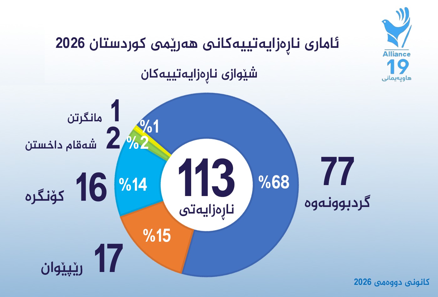 3ی شوباتی 2026: تۆڕی هاوپەیمانی19 (سەنتەری میترۆ سەپەرشتی دەكات)، لە كانونی دووەمی 2026، چاودێری (113) چالاكی مەدەنیی ئاشتیخوازانەی لە شارەكانی هەرێمی كوردستان كردووە، كە رێژەی (86%)ی بۆ پشتیوانی كۆمەڵگەی كوردستانی رۆژئاوا و ناڕەزایی دەربڕین بوون بەرانبەر هێرشەكانی سوپای سوریا بۆ سەر رۆژئاوای كوردستان و زیانگەیاندن بە دانیشتوانی مەدەنی ئەو ناوچانە.